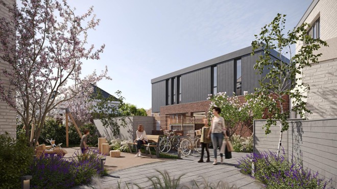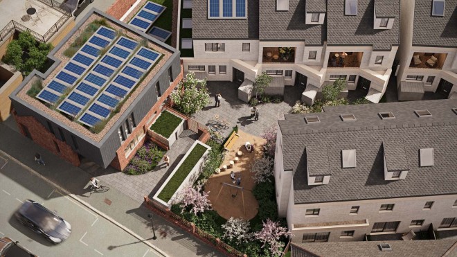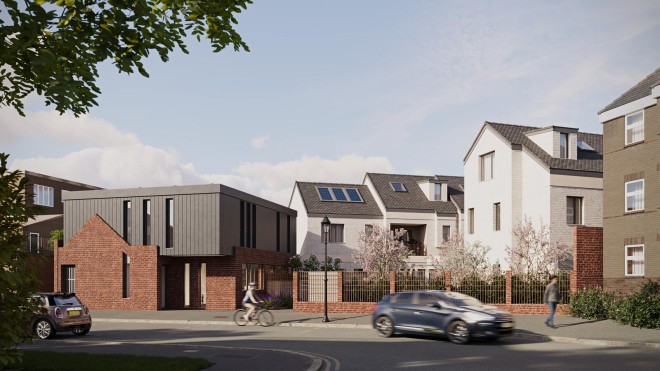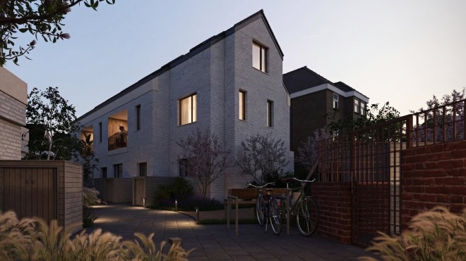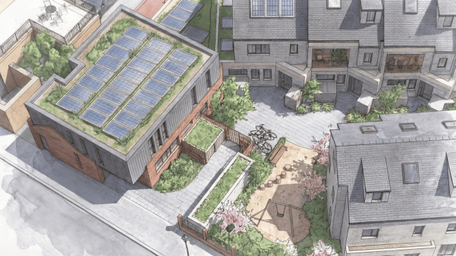 Securing planning permission for the transformation of a neglected London infill site into eight high-quality family homes and two modern commercial units, arranged around a landscaped shared courtyard with children's play space, cycle storage, and biodiversity enhancements, delivering much-needed family housing on a sustainable brownfield site minutes from the station.
